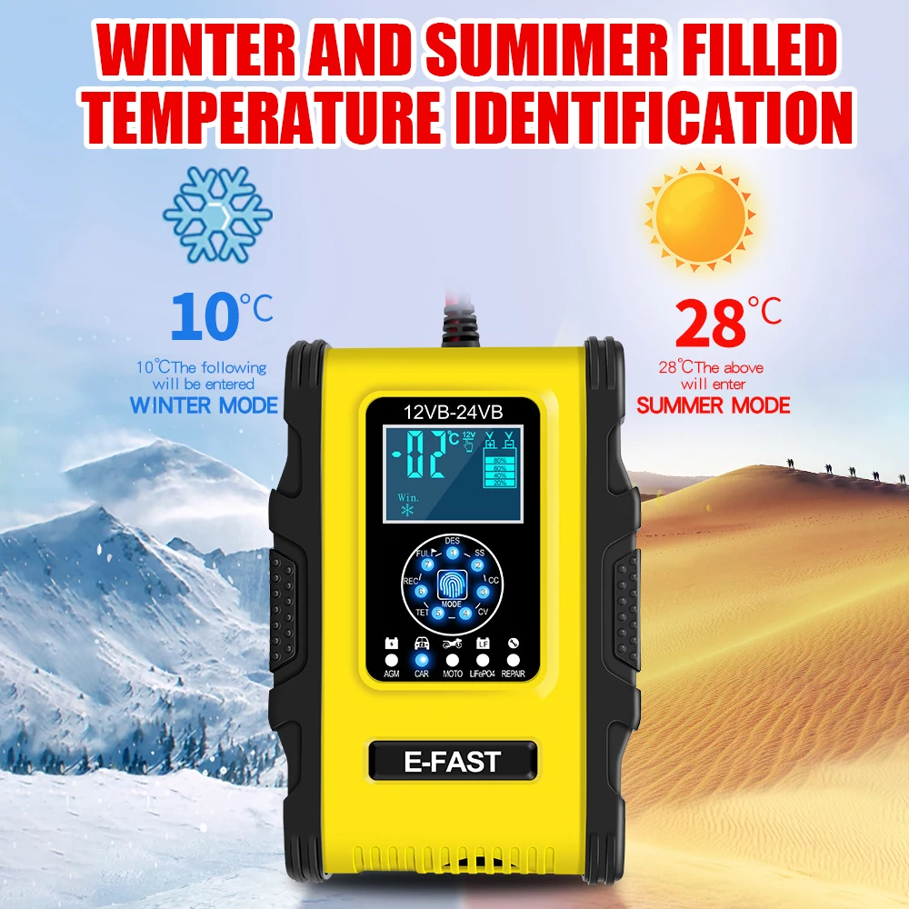 - Зимний и летний режим, подзарядка: зарядное устройство автоматически определяет наружную температуру и автоматически запускает зимний или летний режим заряда; автоматически выбирает соответствующее напряжение зарядки в соответствии с температурой без необходимости регулировки.