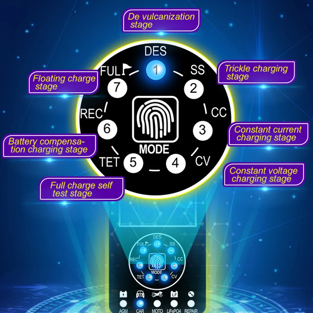 Процесс зарядки семиступенчатый: Десульфатация, прогрев малым током, заряд постоянным током, заряд постоянным напряжением, тестирование батареи, дозаряд после теста, подержание заряда (плавающий заряд).