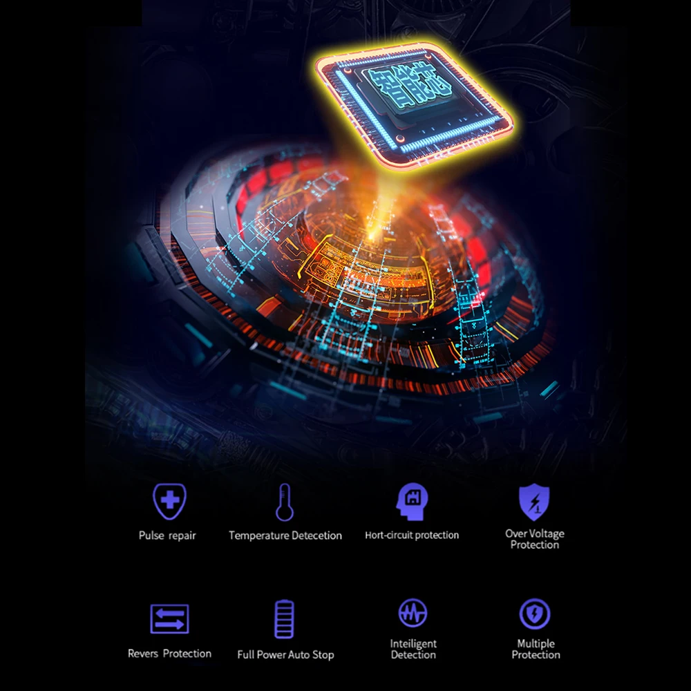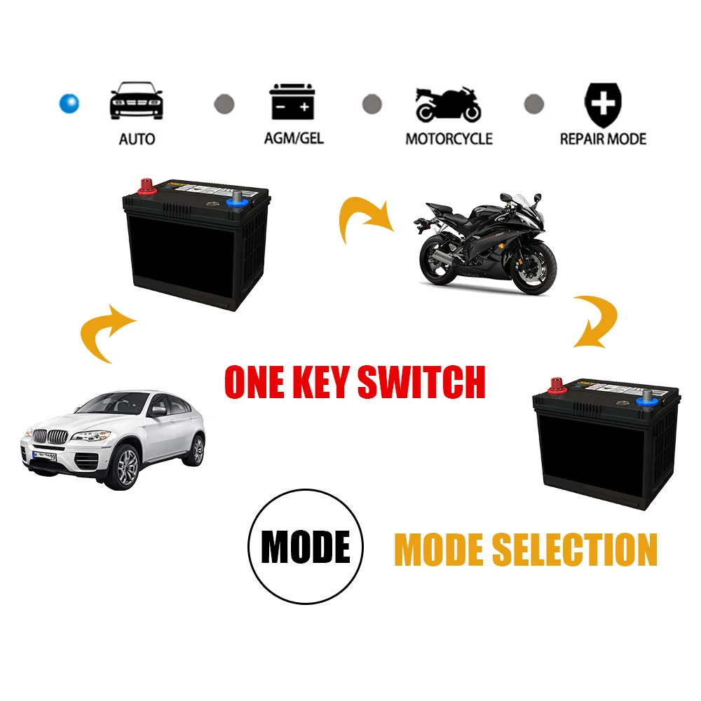 Интеллектуальное зарядное устройство после подключения к аккумулятору больше не требует внимания: зарядное протестирует состояние аккумулятора и выберет режим заряда в зависимости от температуры и состояния батареи, не требует регулировки.