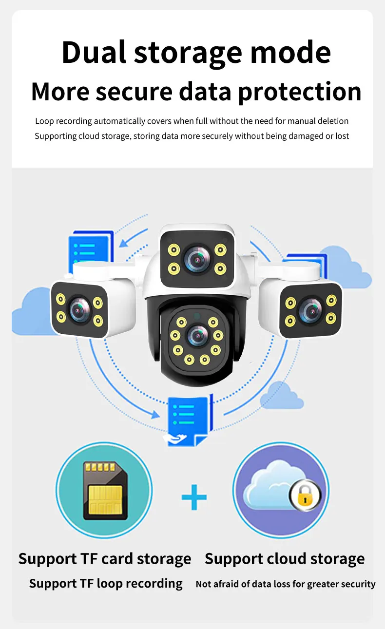 -- Бездротові зовнішні камери безпеки Difang підтримують два варіанти зберігання — локальне сховище на SD-карті (не входить до комплекту), до 128 ГБ без щомісячної плати; або хмарне сховище з безплатною 30-денною пробною версією,