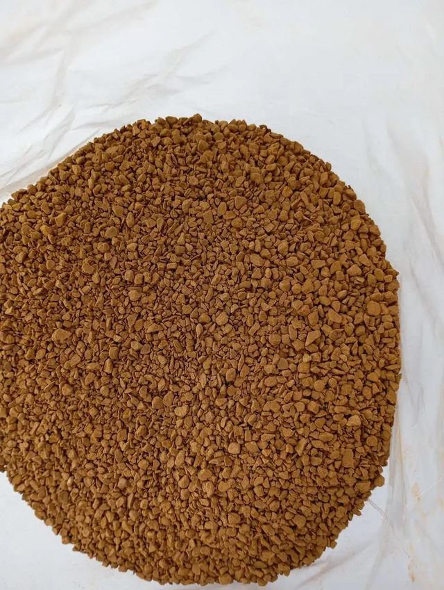 Виготовлені щільні пласти кави дроблять на дрібні кристали або гранули.