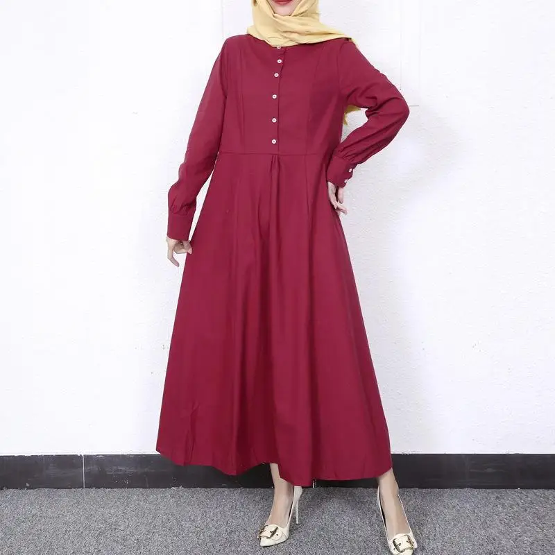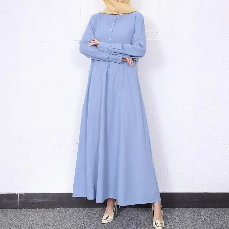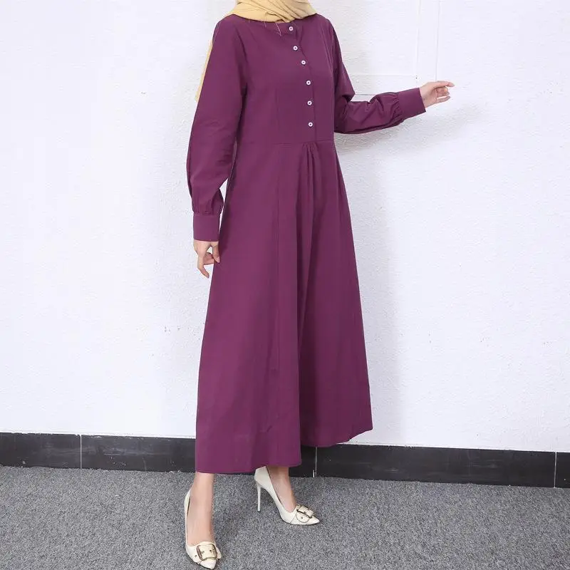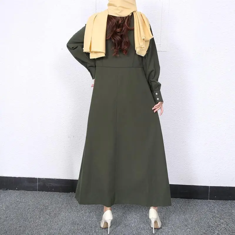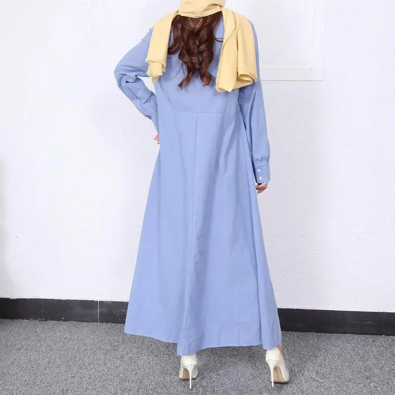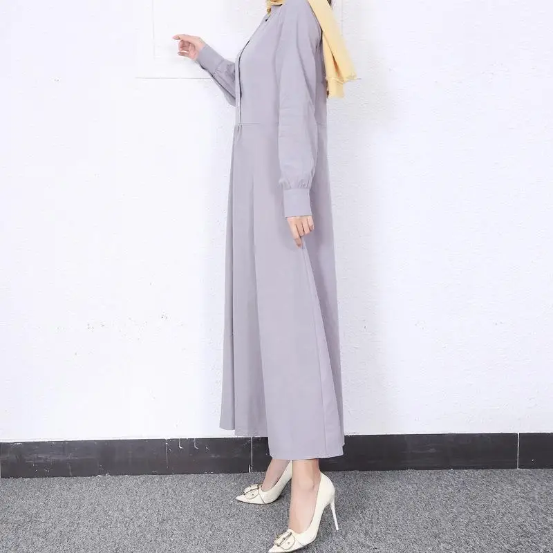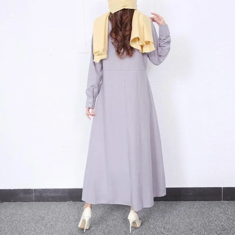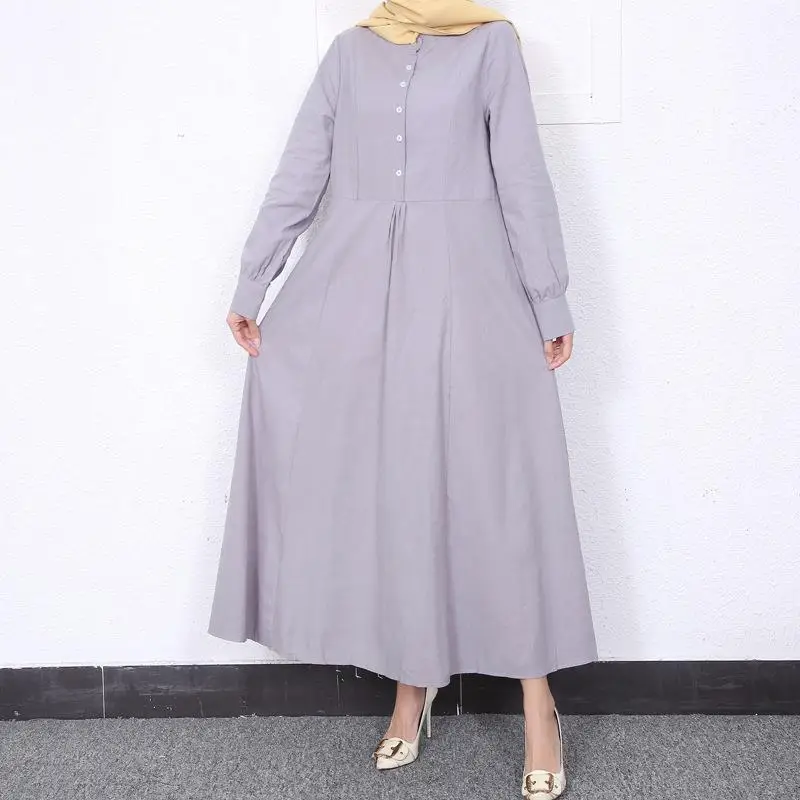 Retro Muslim Abaya Long Robe Spring Casual Loose Waist round Neck Big Swing Style Cotton Solid Color Patchwork Dress