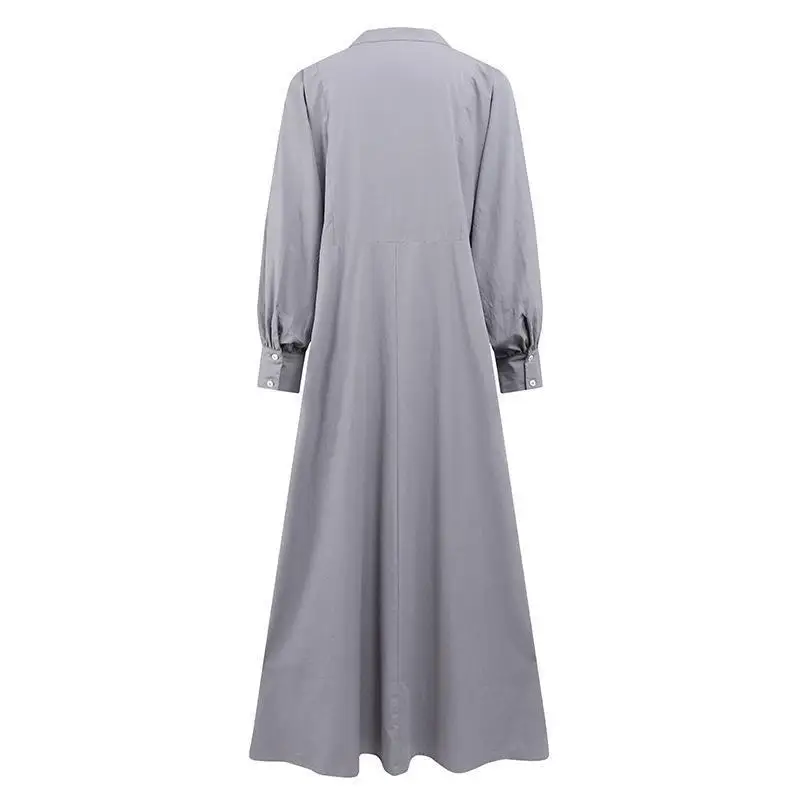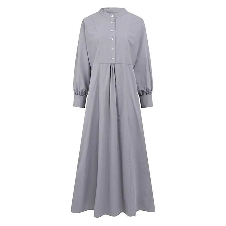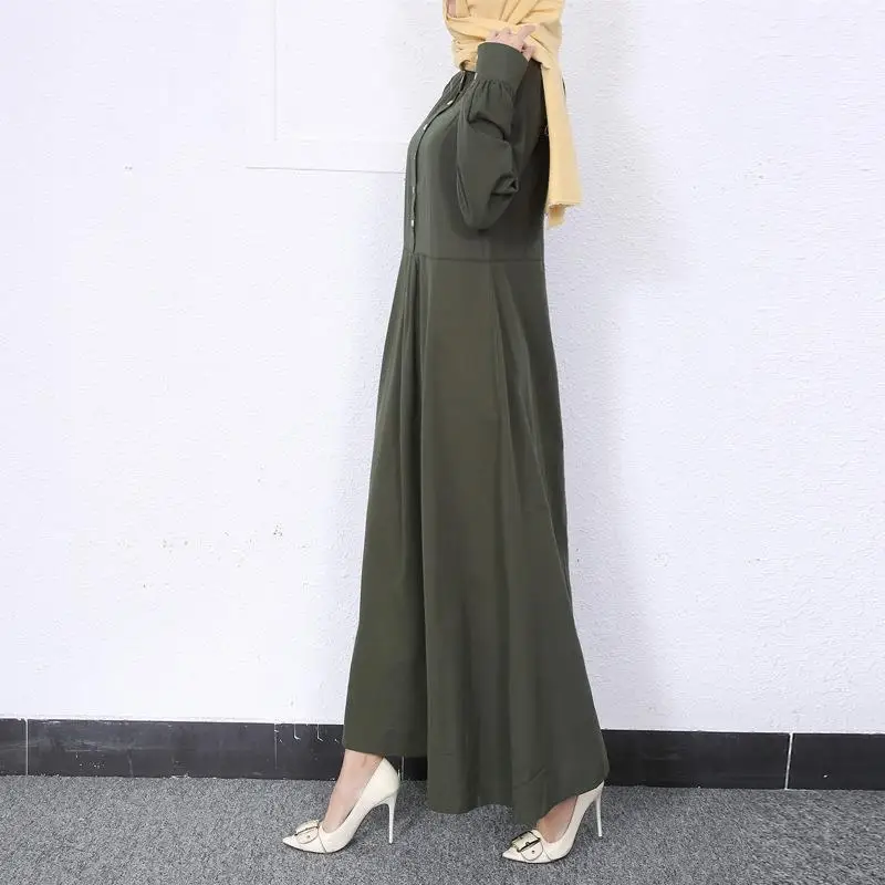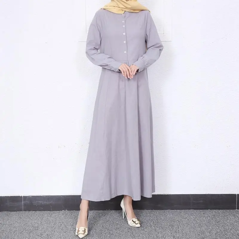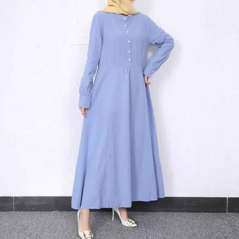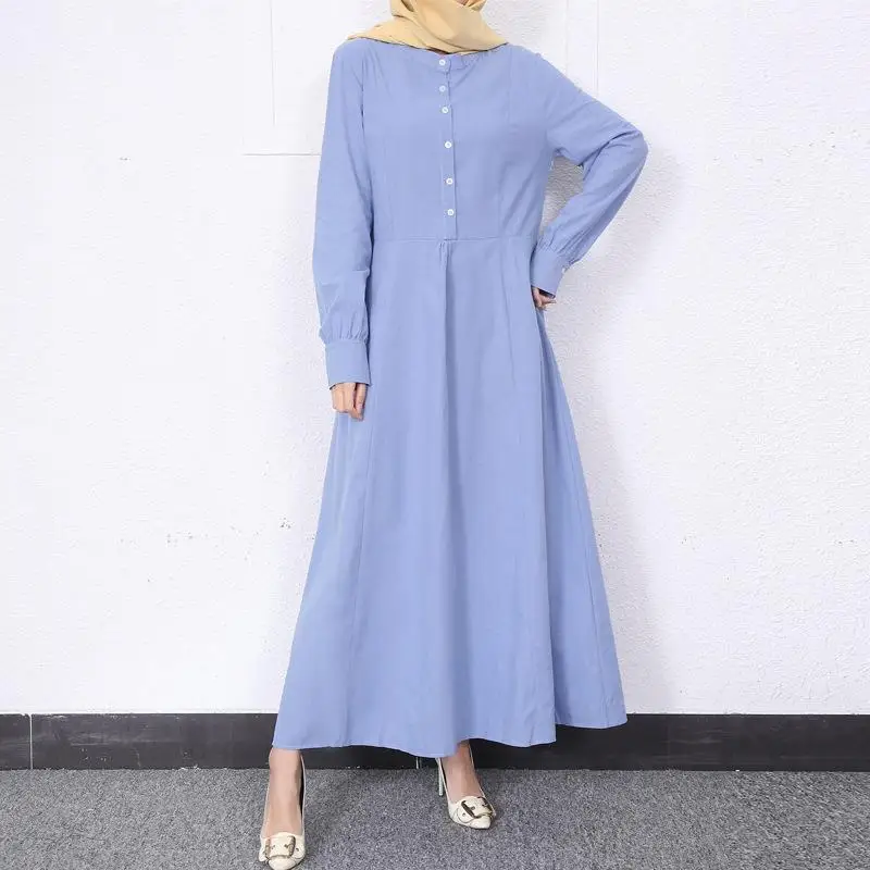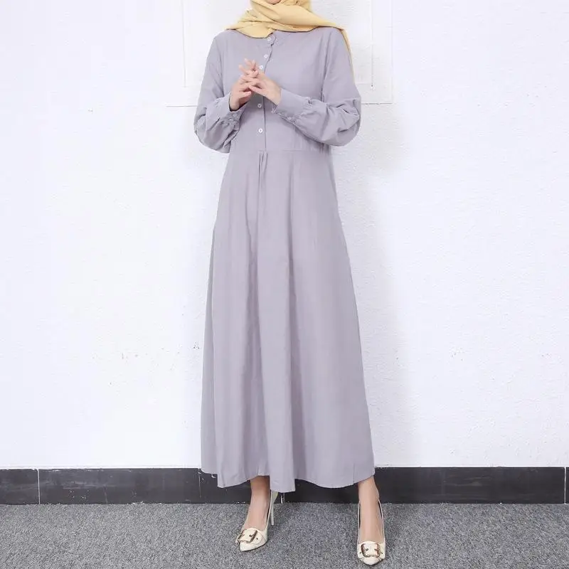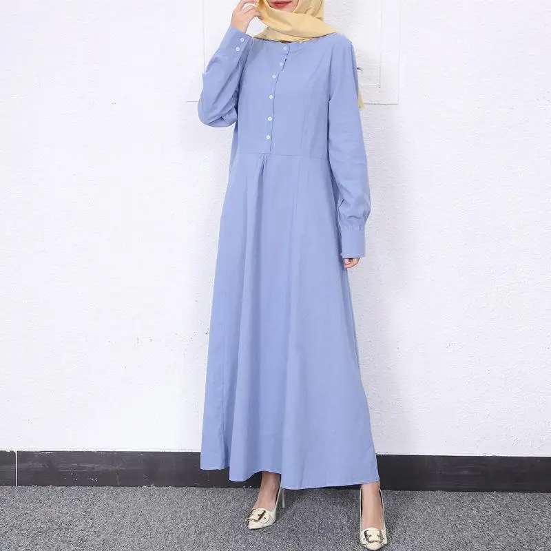 Retro Muslim Abaya Long Robe Spring Casual Loose Waist round Neck Big Swing Style Cotton Solid Color Patchwork Dress