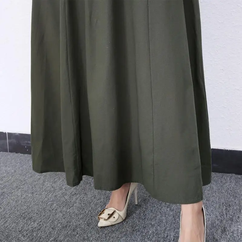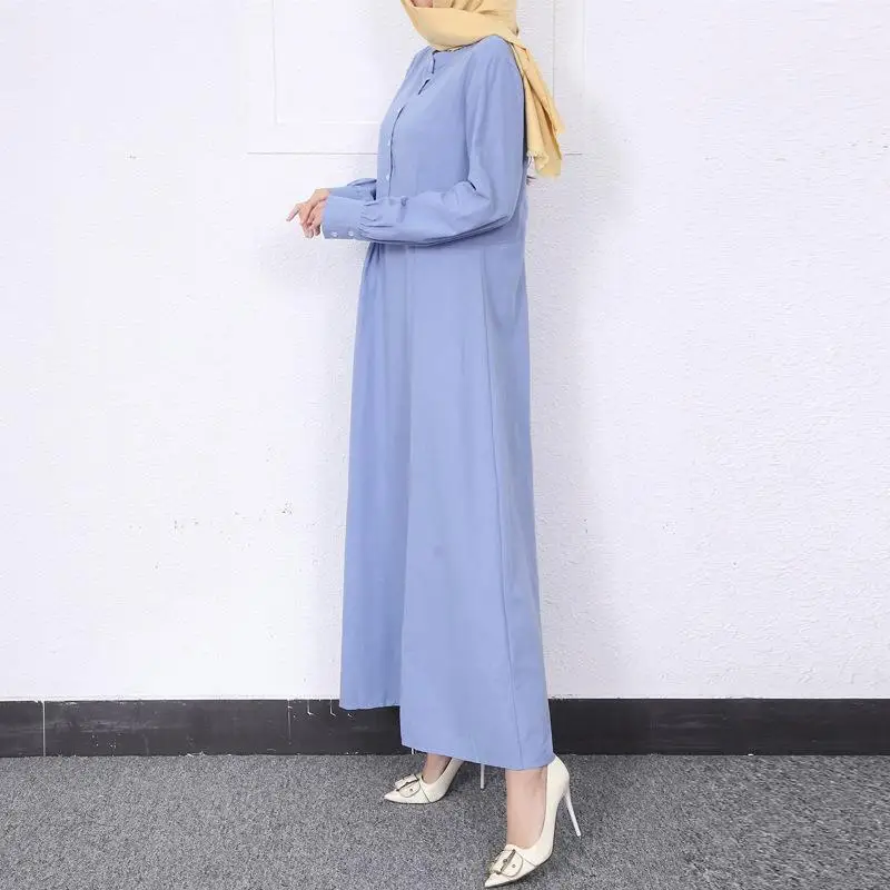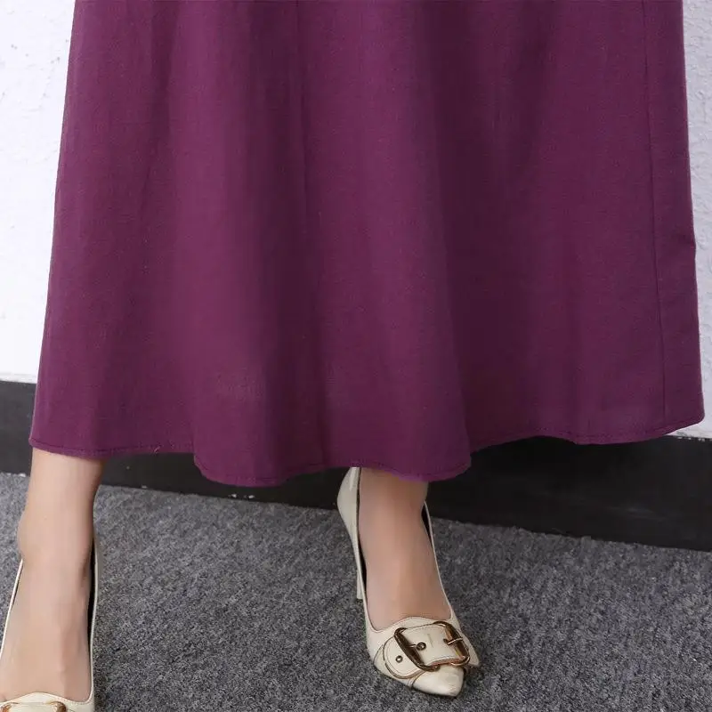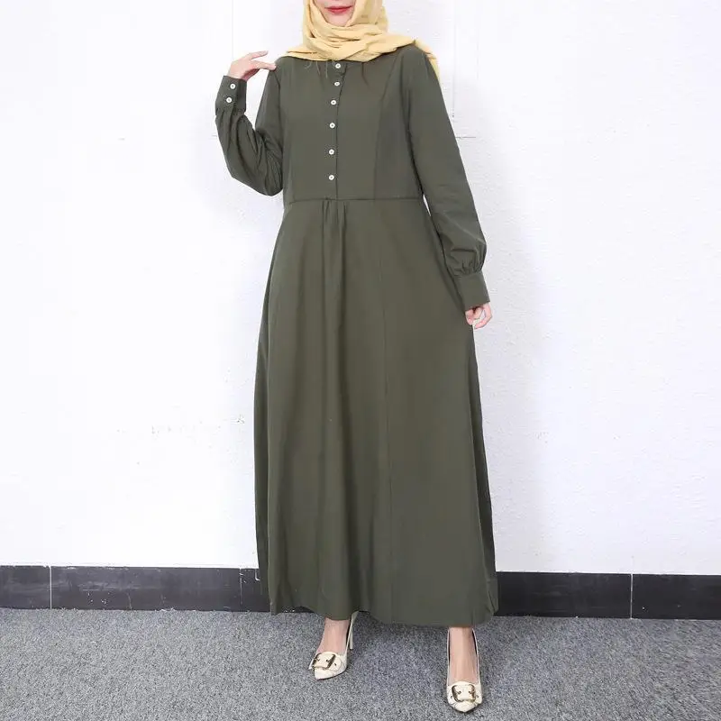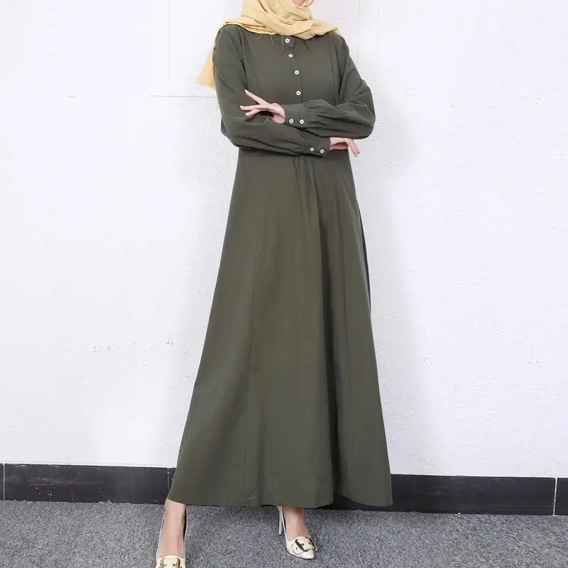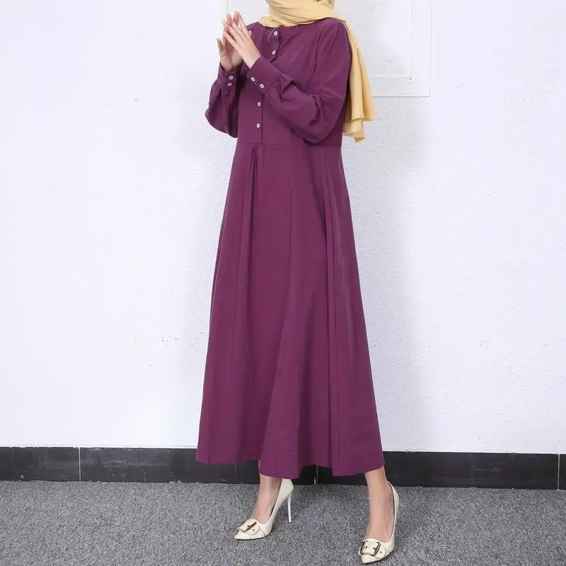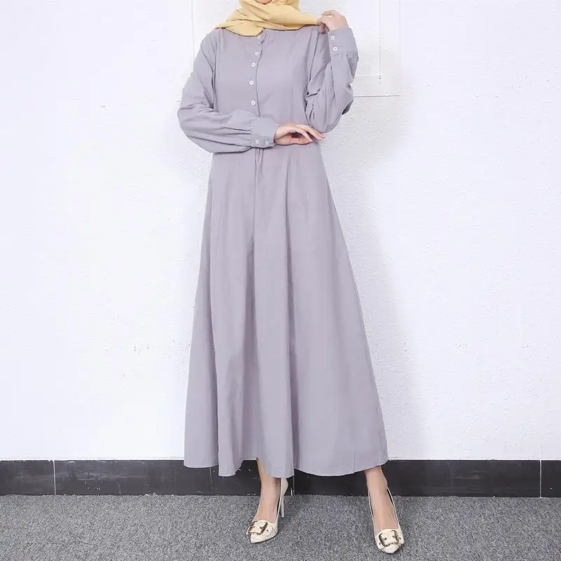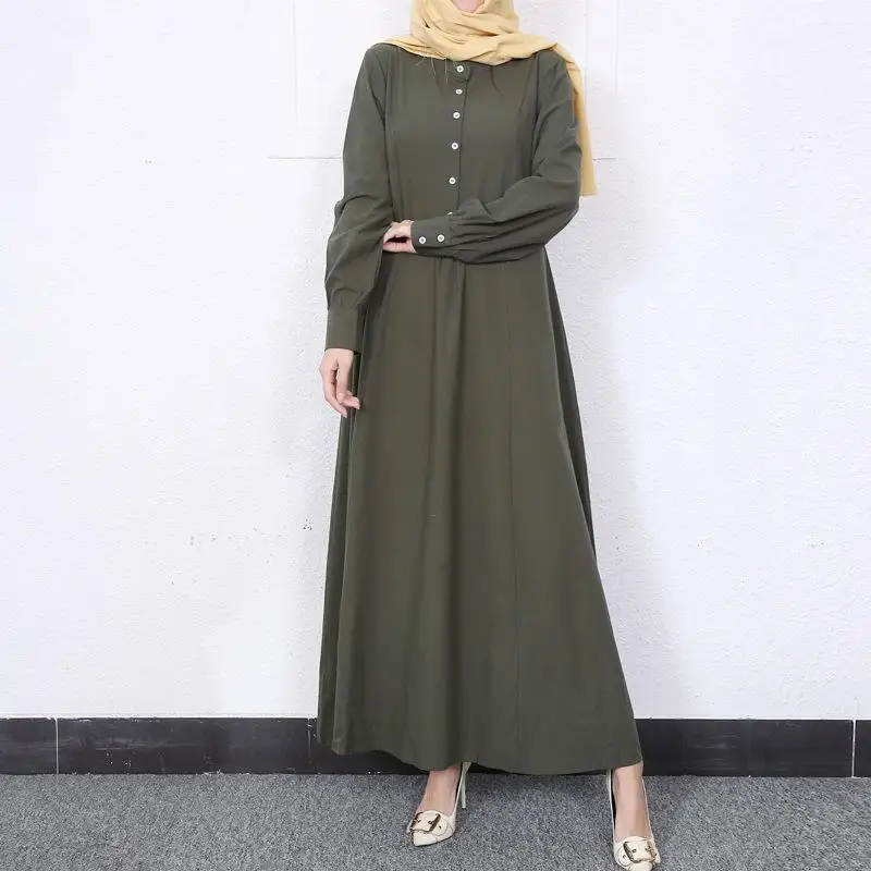 Retro Muslim Abaya Long Robe Spring Casual Loose Waist round Neck Big Swing Style Cotton Solid Color Patchwork Dress